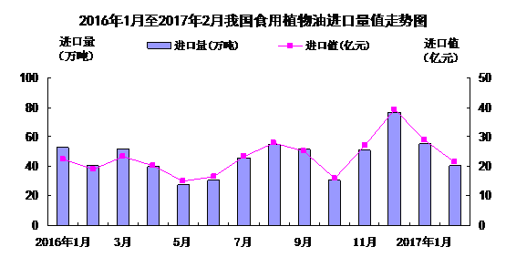 (一)棕櫚油、菜子油庫存較低帶動(dòng)食用植物油整體進(jìn)口增加。去年12月底,全國港口食用棕櫚油庫存僅27.08萬噸,處于歷史低位,出于補(bǔ)庫存的需要,去年四季度國內(nèi)貿(mào)易商訂購了大量今年一季度船期的貨,截止3月1日,全國港口食用棕櫚油庫存增加57.5萬噸,但仍低于去年同期88萬噸的庫存水平。同時(shí),自2015年起,我國共進(jìn)行了43次臨儲(chǔ)菜子油拍賣,成交416.29萬噸,截至目前,臨儲(chǔ)菜油剩余量已經(jīng)不足200萬噸,在今年新作油菜籽上市前,臨儲(chǔ)菜油有望全部拋售完畢,而2016年我國油菜籽產(chǎn)量為1400萬噸,比上年下降5.7%。國內(nèi)產(chǎn)量不足,臨儲(chǔ)菜油即將拋售完畢,貿(mào)易商擴(kuò)大菜油進(jìn)口以補(bǔ)充缺口。前2個(gè)月,我國進(jìn)口棕櫚油和菜子油同比分別增加6.5萬噸和2.7萬噸,拉動(dòng)我國食用植物油整體進(jìn)口量增加。