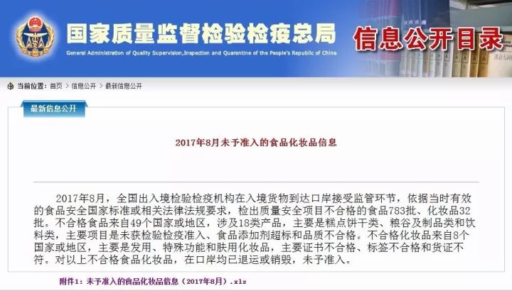 博裕食品進(jìn)口報關(guān)行獲悉,近日,國家質(zhì)量監(jiān)督檢驗檢疫總局官網(wǎng)公布了《8月未予準(zhǔn)入的食品化妝品信息》名單,其中包括質(zhì)量安全項目不合格的食品783批、化妝品32批。