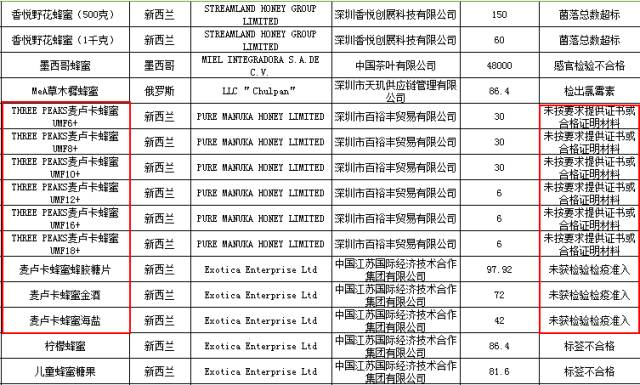 其中包括多批次新西蘭麥盧卡蜂蜜被查出未按要求提供合格證書或合格證明材料。