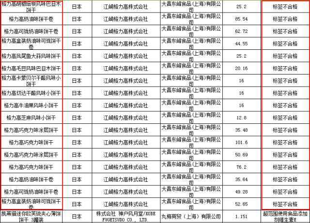 同時榜單中相對較為知名的格力高系列餅干,均因為標(biāo)簽不合格被查處。