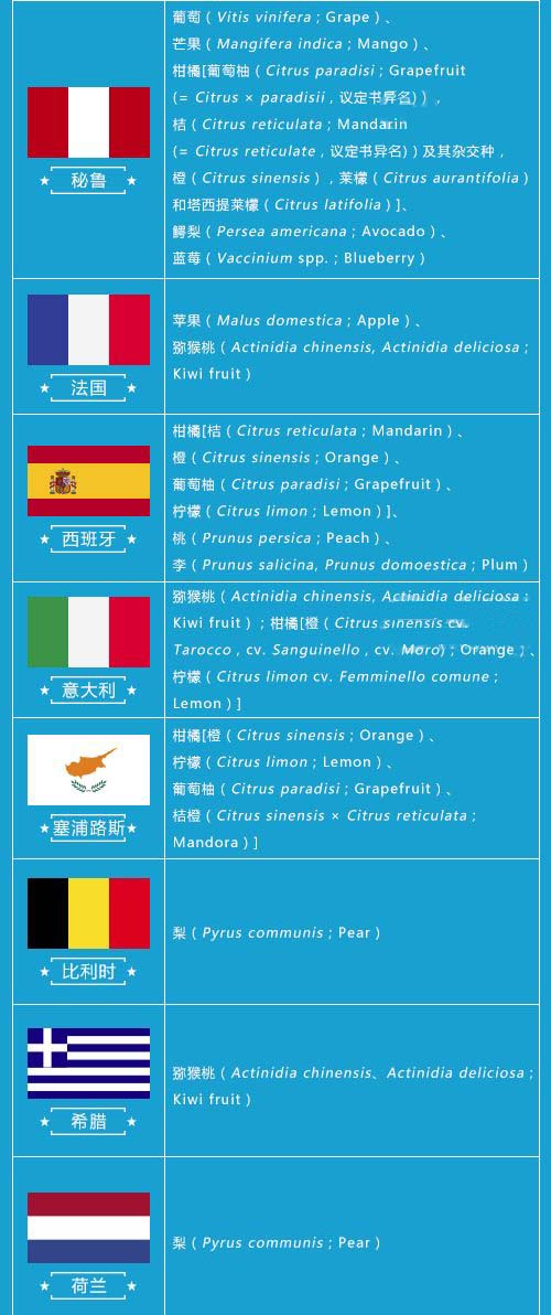 博裕食品進口報關行獲悉,近日,國家質檢總局官網更新2018年進口水果準入名單,博雋進口了解到這是今年第一次更新的進口水果準入名單。在本次更新名單中的有:澳大利亞桃(Prunus persica;Peach)、李(Prunus domestica、Prunus salicina;Plum)、杏(Prunus armeniaca;Apricot)、新西蘭牛油果(Persea americana;Avocado)、以及阿根廷藍莓(Vaccinium spp.;Blueberry)。