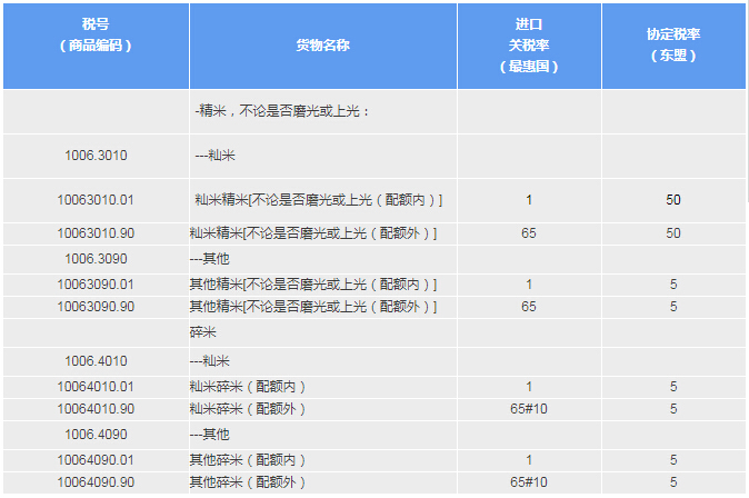 舉個例子:稅號1006.3010項下的秈米,配額內(商品編碼10063010.01)的進口關稅稅率為1%,配額外(商品編碼10063010.90)的進口關稅稅率則為65%。